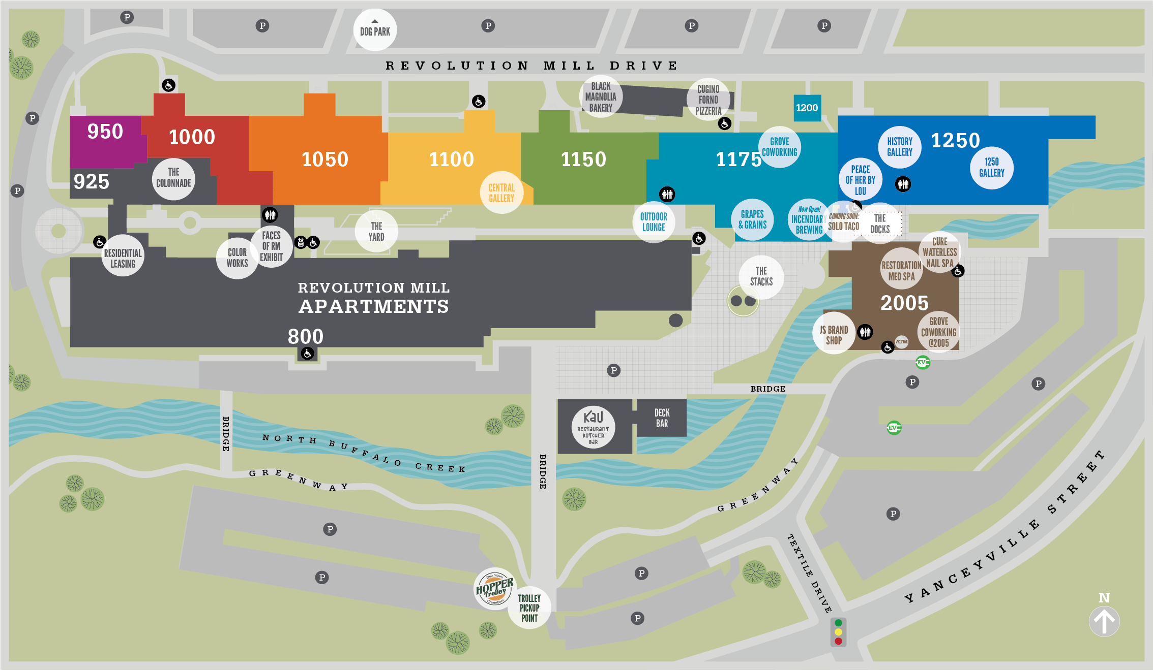 Color-Coded Building Numbers: Use the color-coordinated building numbers to easily navigate the mill. These colors are your best guide to finding the right building or tenant and making your way through the space.